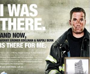 Sadly, a tasteless law firm ad wouldn’t be particularly interesting news. But a tasteless ad that also falsely places a firefighter at Ground Zero — without the knowledge of the firefighter? Well, you just have to ask if there is anybody at Worby Groner Edelman & Napoli Bern with a basic sense of propriety.