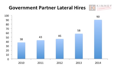 Partners specializing in governmental work (which includes both lobbying and regulatory-oriented practice) were also in particularly strong demand last year, with more than 90 lateral hires, an increase of more than 55 percent from 2013. Unsurprisingly, the Washington, D.C. market accounted for the bulk of these hires. It would appear that political gridlock, if nothing else, can be a boon to high-end legal practice.