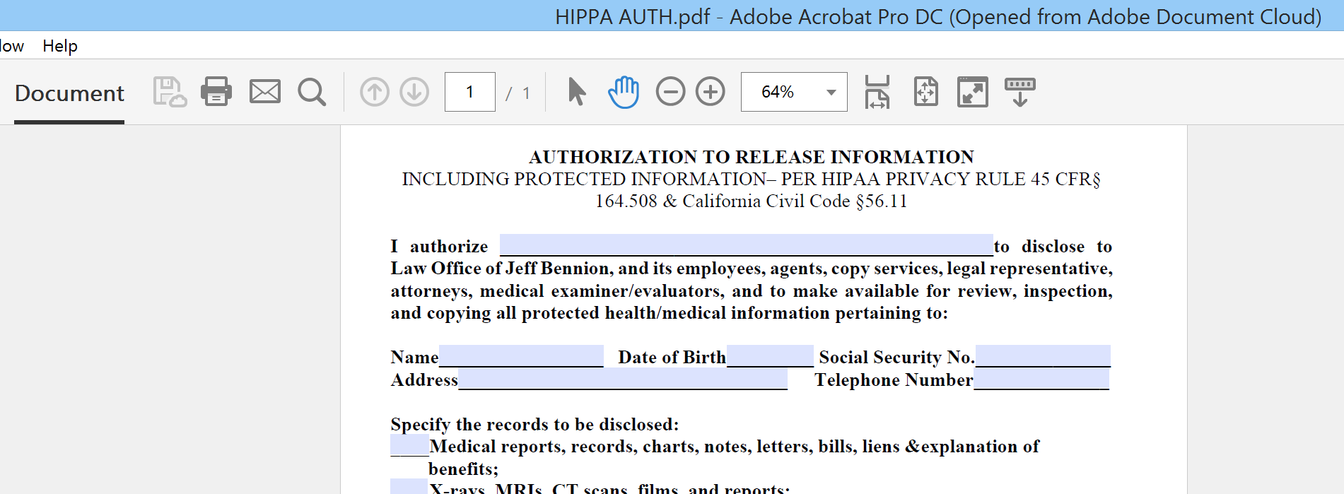 Adobe gives you the option to track your recently opened documents across devices and open documents on one device that you were looking at on another device. Here is a HIPAA authorization I had open on my work computer and am accessing from home. Note, it says at the top “Opened from Adobe Document Cloud.”