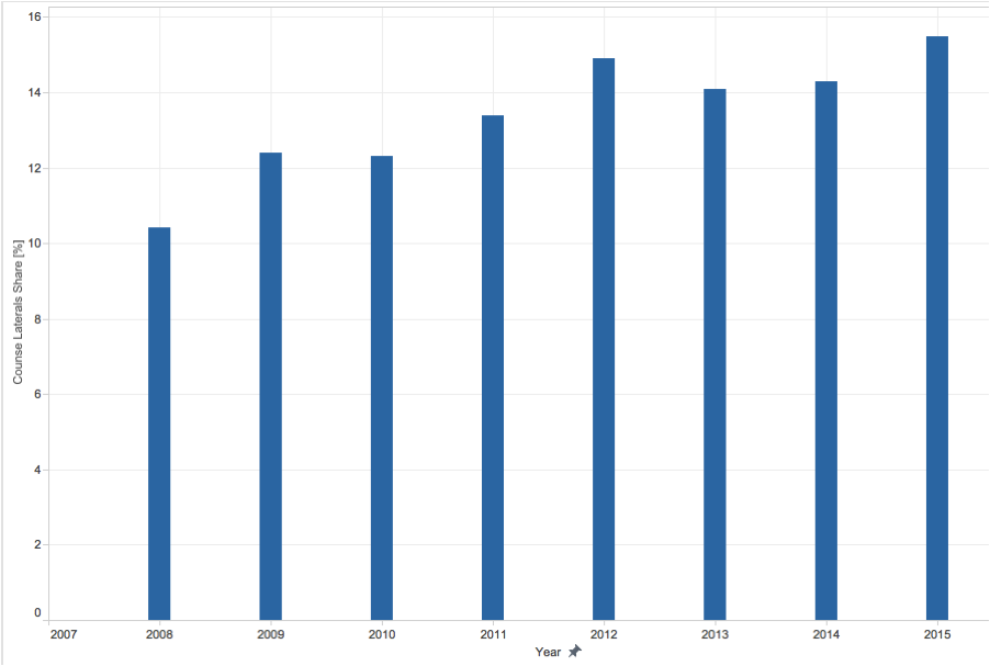 In 2015 year to date, 1,244 counsels have lateraled within the Am Law 200. These laterals account for 15.5% of the total moves so far this year. Counsel’s share of the lateral market is up 50% for the same period in 2008, and 8.4% from the same period last year.