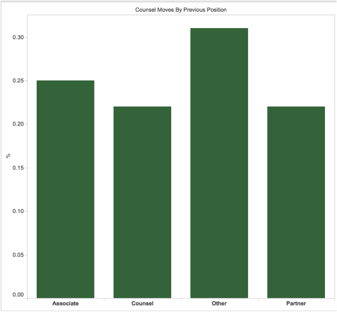 By randomly sampling 100 lateral moves into counsel positions in 2015, we found that around 22% of these counsel moves were from attorneys leaving another counsel position. Comparatively, there were an equal number of partners transitioning to the counsel role over this period. The “other” category, characterized by those who entered/re-entered Biglaw from governmental or corporate positions, lateralled the most out of any group. This group is split fairly evenly between governmental and corporate positions.