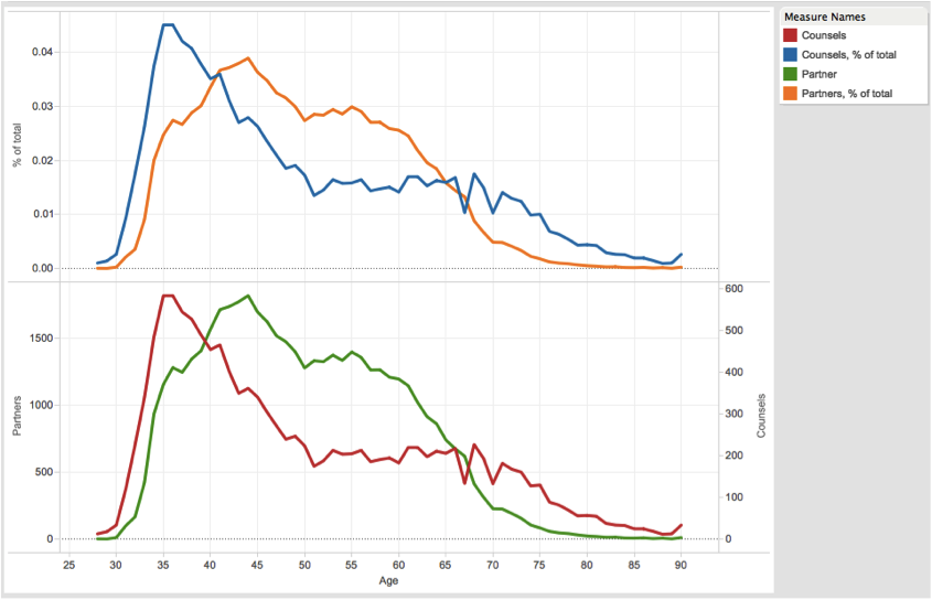 There is a large spike in the number of counsels at age 35 and 36. The distribution of partner ages also grows here as well but continues growing rapidly as the distribution of counsel decreases after 36. This observation suggests that many of these counsels are making partner. The latest promotion report backs this inference. Of attorneys promoted to partner this year, approximately 38% were counsels before their promotion.