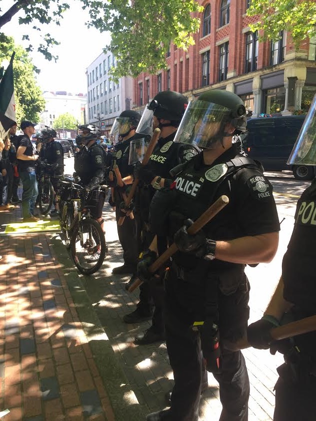 Eventually the bulk of the counter-protesters moved back down the hill to Occidental Park. I thought my role was over, and I looked forward very much to a bathroom break. However, some “Anti-Sharia” people decided the party was not over, and headed down as well for more confrontation. The police were buzzing around setting up more bike barriers, and then people were getting tear gassed, and everyone was running. There were people on the ground writhing around in pain. Some people were arrested. The tension in the air was like its own physical being, creating a buzzing sound in my inner ears (or maybe that was the tinnitus from the freight-train noise machine). I located my buddy, who had lost but then recovered his notebook in the melee, and wrestled with the conflicting notions that I should avoid getting tear gassed but also that I was there to witness events that may involve tear gas. I saw in my mind’s eye my mom shaking her head.