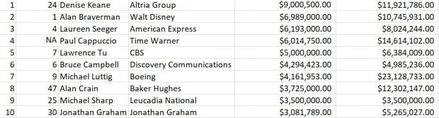 This year’s top 10 list reflects even more movement than last year’s list. Five of the listed lawyers — Denise Keane of Altria, Paul Cappuccio of Time Warner, Alan Crain of Baker Hughes, Michael Sharp of Leucadia National, and Jonathan Graham of Jonathan Graham — didn’t crack the top 10 last year (Cappuccio wasn’t there due to an error), and five more — Thomas P. Mason of Energy Transfer Equity, Gerson A. Zwiefach of 21st Century Fox, Bruce Sewell of Apple, Maryanne Lavan of Lockheed Martin, and John G. Finley of Blackstone Group — have disappeared from the top 10 altogether.