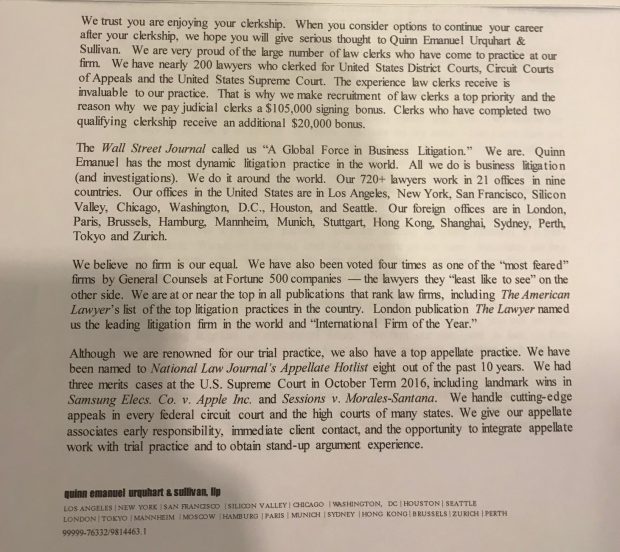 QUINN EMANUEL — LETTER TO FEDERAL LAW CLERKS