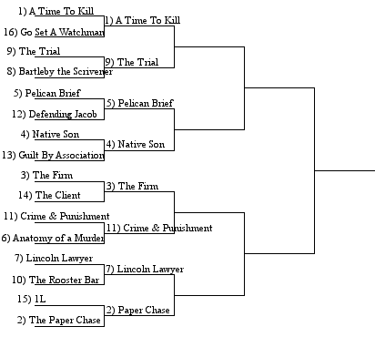 The first round is complete in our quest to crown the greatest work of legal fiction of all time. We have winners and losers and new matchups to vote on. Today we focus on the results from our movie region and our book region. Unlike the basketball tournament, most of our matchups in these regions went according to seed. Even the upsets were, in retrospect, predictable.