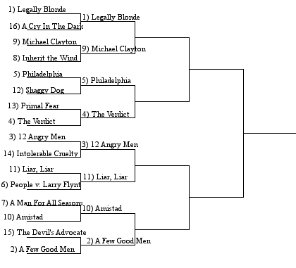 (1) Legally Blonde vs. (9) Michael Clayton — Legally Blonde obliterated its first-round opponent and enters the second round with all the momentum in the world. Michael Clayton, on the other hand, proved it was the fittest by surviving a bout with Inherit the Wind by 1 vote.