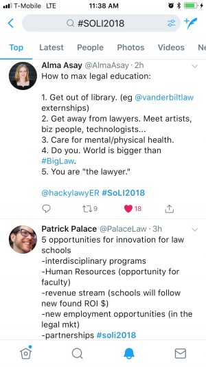 I caught up with organizers, Larry Bridgesmith and Cat Moon after the conference. As an aside, just prior to SoLI, Cat was promoted to Director of Innovation Design at Vanderbilt Law School’s Program on Law & Innovation.