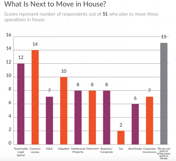 You may be wondering, isn’t there a limit to how much work a client can bring in-house? The answer, of course, is “yes” but clients are going to keep riding this train as far as it can carry them. We should start seeing clients turn the cost corner and embrace outside counsel again, but it doesn’t seem like they’ve gotten there (or at least they don’t think they’ve gotten there) yet. So what’s the next category of work that clients plan to bring in-house according to the survey?