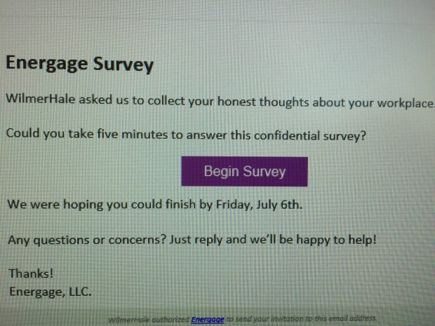 A good rule of thumb for whichever staff offices were charged with quarterbacking these surveys: under no circumstances should anything be sent as a mass email to the associates during raise or bonus season unless it’s about money or the importance of cooperating with the FBI agents who just raided. As we can’t imagine any scenario where Katten (or WilmerHale) would face the latter issue, let’s just stick with not sending out anything during cash time.