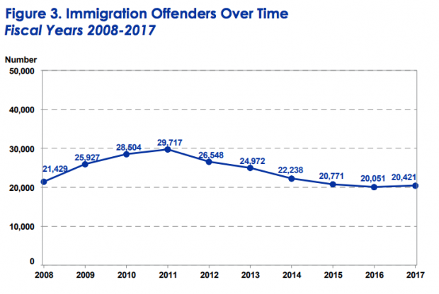 Over the last decade, U.S. attorneys across America have charged more people with immigration offenses than almost any other kind of crime the federal government is responsible for. In 2017, 30.5 percent of cases reported to the Sentencing Commission were related to immigration crimes. That’s more than 20,000 people with criminal immigration cases in federal court in 2017, just a few hundred less than were charged with drug crimes. About 15 percent of those immigration cases were related to human smuggling, where you might normally think federal prosecutors should be involved. But more than 80 percent — so more than 15,000 people — were charged with illegal reentry.