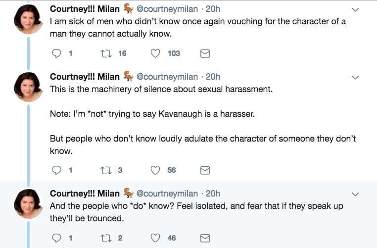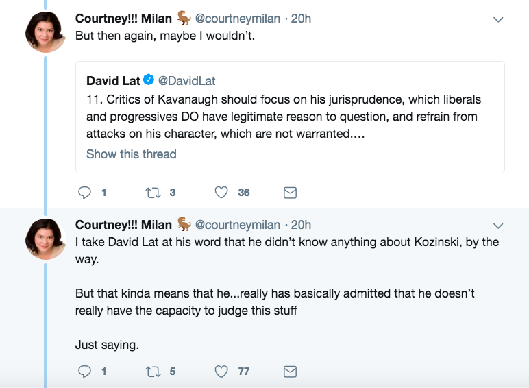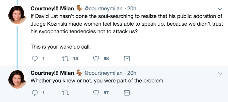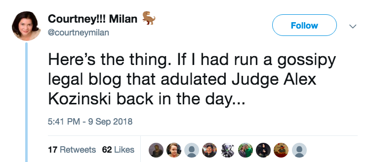 Over the weekend, inspired by some aggressive tweeting in support of Brett Kavanaugh from Above the Law founder David Lat, Courtney Milan had some things to say. Milan, for those that don’t remember, is the pen name for former Kozinski clerk Heidi Bond, one of those to come forward with disturbing stories of harassment in his chambers. Milan notes that the coverage Kozinski enjoyed, particularly in this publication’s early days, raised him to the level of judicial superstar and that this reputation insulated him from criticism and was part of the reason why others didn’t come forward with stories about Kozinski earlier.