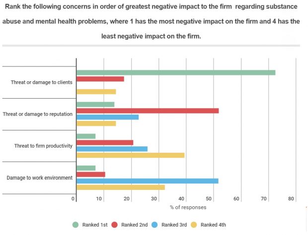 The overwhelming majority of law firms report that alcohol abuse, depression and anxiety are occurring at their firms; half said the same about drug abuse. The stigma surrounding substance abuse, addiction and mental health problems is pervasive in Big Law. Firms are providing at least some training and resources around these issues, but they appear to be insufficient, underutilized, or both. In addition, firms worry most about addiction and mental health problems in the context of potential harm to clients, and see stress and workload as the No. 1 driver of the problems.