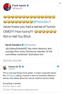 It started when Sarah Huckabee Sanders used the official @PressSec Twitter account to exalt Lindsey Graham’s angry shock that people somehow care that a potential lifetime appointee has been credibly accused of sexual assault. But instead of expressing disgust in the privacy of his own corner office, Aquila took to Twitter, which would have been fine, except for the misogynistic language he used. Yeah, telling a woman — no matter how vile her opinions — to “Rot in Hell You B!tch” isn’t a good look when you’re trying to express your support for victims of sexual assault.