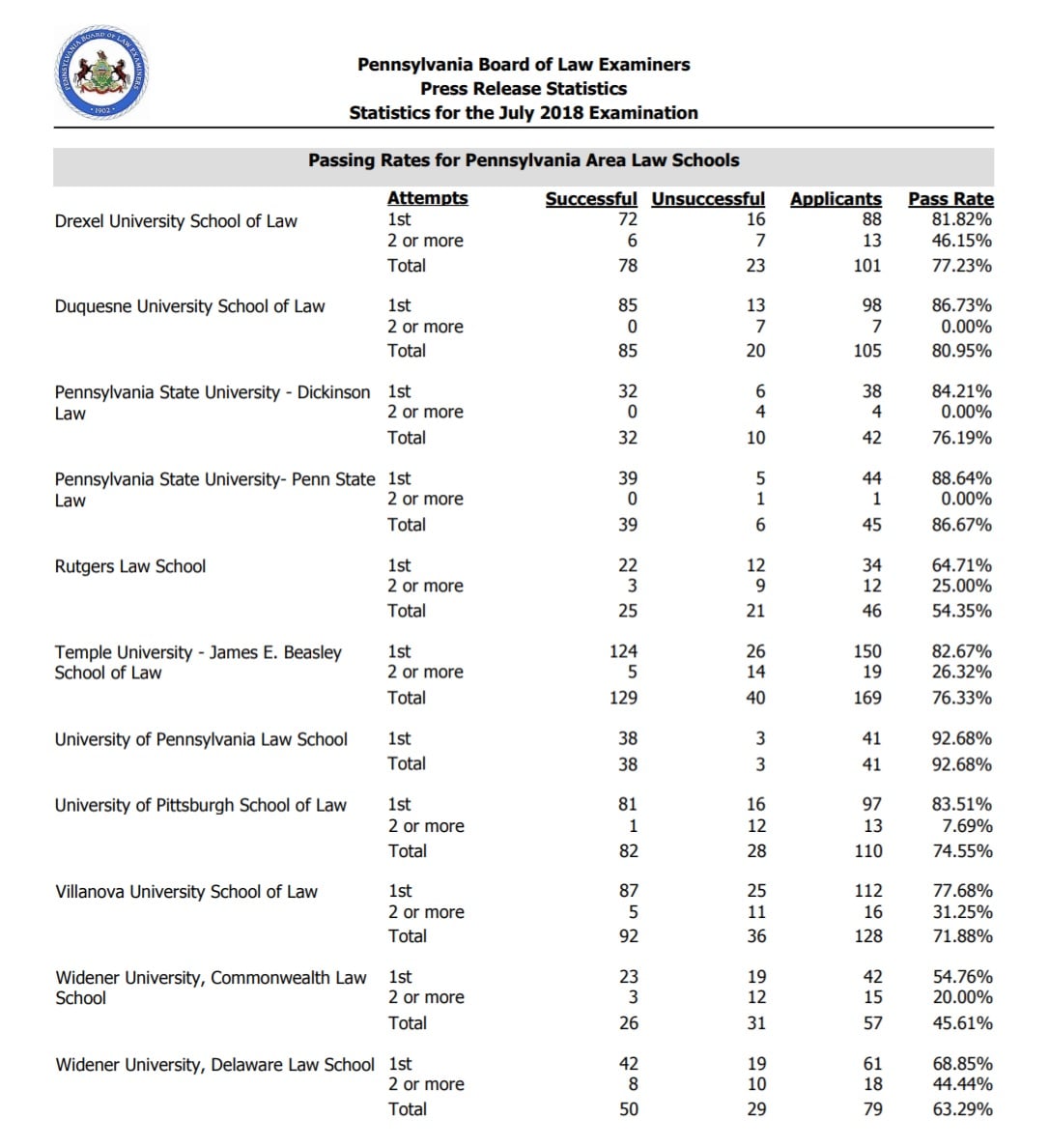 Here are the results for all Pennsylvania-area law schools for the July 2018 exam: