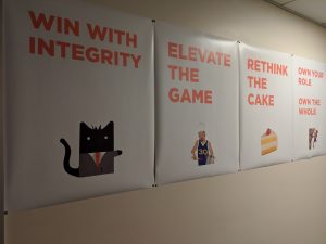 Over there are lawyers and paralegals in their respective practice groups: finance, general counsel, blockchain. Oh yes, these posters exemplify the values of the company. Yes, yes, that IS Chef Curry with the Pot. Here, take a sticker.