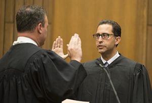 Judge Vince Chhabria (N.D. Cal., at right) being sworn in by Judge Gregg Costa (5th Cir.). (Public domain photo via the U.S. Court of Appeals for the Ninth Circuit.)