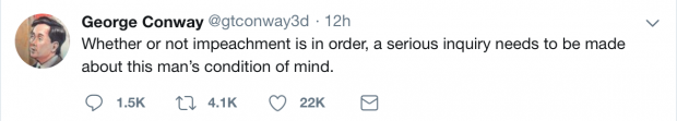 That many of his public postings rip Trump as a liar despite the fact that Conway’s own wife composes and repeats most of those same lies drives a lot of the fascination with George’s tweets. Moreover, how does the infamously petty Trump keep Kellyanne around when every day brings another devastating rebuke from her husband?