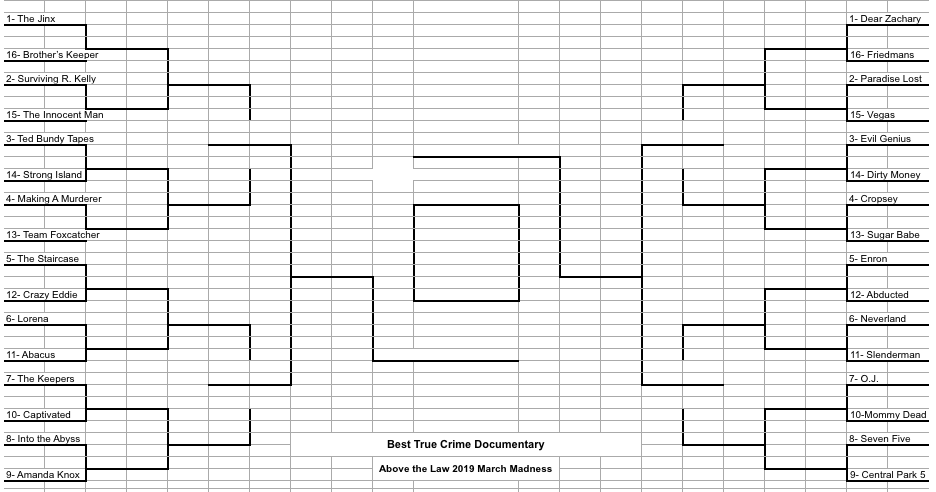 Yesterday we started our 2019 legal March Madness feature, wherein we try to determine the very best true crime documentary. Because who doesn’t love binging Netflix (or Hulu or Amazon Prime) for their dose of “oh my god, I can’t believe this is real”?