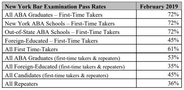 But that’s not where the good news ends. First-time takers from ABA-accredited law schools saw their pass rates increase by 3 percent from the Februrary 2018 exam to 72 percent, the highest pass rate the state has seen since February 2014. The pass rate for first-time takers from New York ABA-accredited law schools also rose to 72 percent (an increase of 2 percent from February 2018), the highest pass rate the state has seen since February 2013. On top of that, a record number of foreign-educated candidates took the New York exam this winter (1,885 people, 46 percent of all test-takers), and their pass rate rose by seven percentage points, to 35 percent.