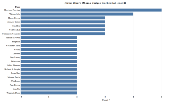 Three Obama nominees were previously partners at Morrison Foerster, three at Mayer Brown, and three at Munger Tolles. Munger Tolles employs approximately 200 attorneys including Obama’s Solicitor General, Donald Verrilli. Morrison Foerster has over 1,000 attorneys worldwide and Mayer Brown has over 1,500.