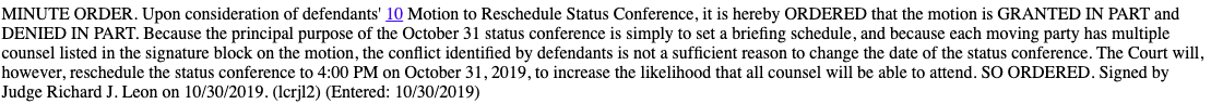 Hahahaha, NOPE. Noting that there are so, so many lawyers entered on this case, Judge Leon agreed to move the hearing … to 4 p.m. today (click to enlarge):