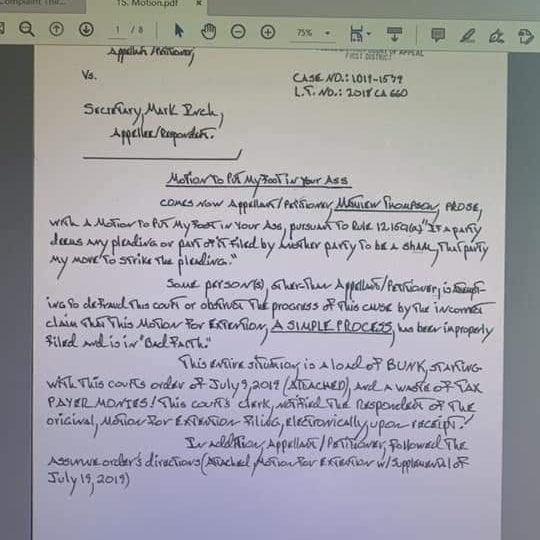 — Matthew Thompson, a prisoner in Florida, in his “Motion to Put My Foot In Your Ass,” pursuant to Florida’s Rule 12.150a(a) (governing motions to strike), which he seems to have taken quite literally.