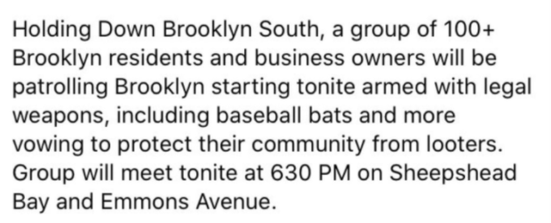 New York had its own “armed patrol group” in South Brooklyn and one of its organizers is a self-described conservative law student at Fordham[1] whose experience putting together a posse should have taught him exactly how problematic his worldview really is.