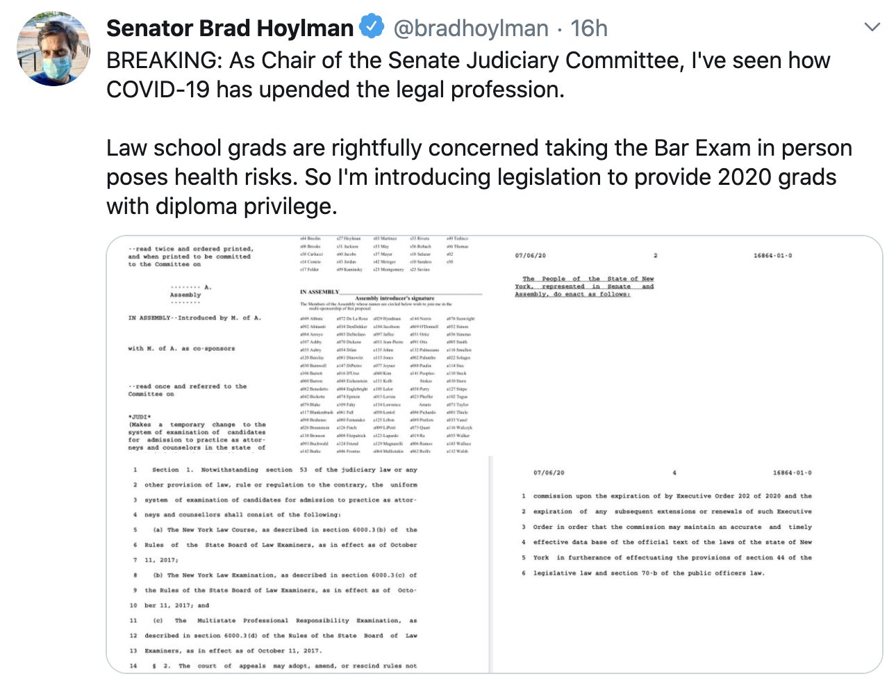 Senator Brad Hoylman, chair of the NY Senate Judiciary Committee, posted on Twitter last night that he was introducing legislation to authorize emergency diploma privilege to graduates of ABA-accredited schools during the ongoing state of emergency. As a technical matter, the draft appears to leave the decision to the NY Court of Appeals but removes any possible impediments to its authority to dispense with the bar exam entirely.