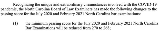 The new score, which is still more restrictive than many jurisdictions including New York, highlights exactly how artificial the “but 20 percent of applicants fail the bar exam” canard is. Bar examiners set the score to arrive at roughly that figure and this announcement is not an accommodation but a recognition that they expect slightly lower overall scores under these conditions. That the examiners simultaneously announced that the score would return to 270 in July 2021 proves that.