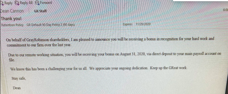 That’s what’s happening at GrayRobinson. The firm, which made $156,100,000 in 2019 gross revenue, making it 169 on the 2020 Am Law 200 ranking, sent an email to all staff members, letting them know they’re getting a bonus, payable today.