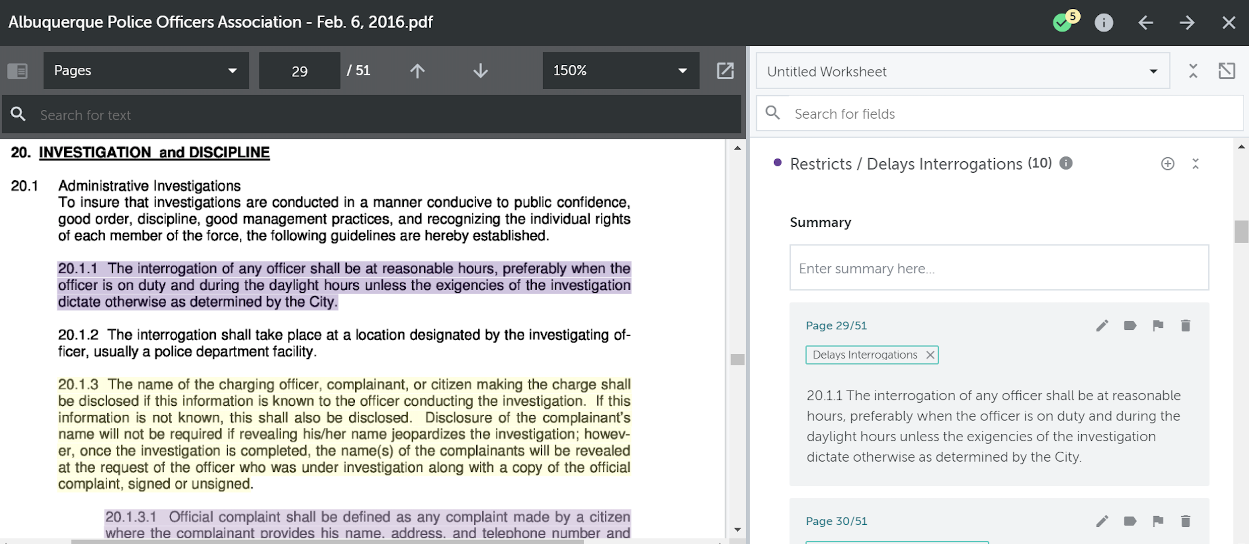 Kira can run through the documents and extract the varied language that fits these concepts. For example drawing out and color-coding all language related to delaying interrogations for easy review.