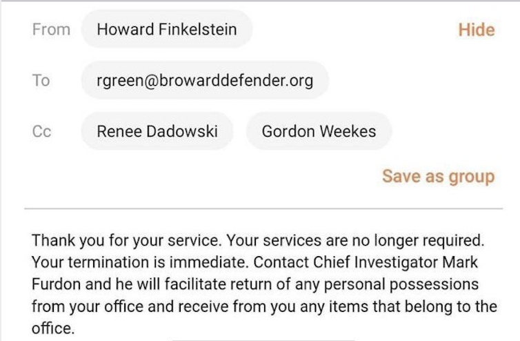 Finkelstein backed another Assistant Public Defender, Gordon Weekes, for the role. Last night’s election netted Weekes around 48 percent of the vote to Green’s 32 percent. That should mark the end of the campaign cycle and a return to the business of fighting in the trenches of criminal justice. Instead, Green was unceremoniously fired: