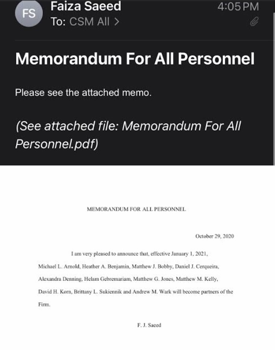 Faiza Saeed, Cravath’s presiding partner (and the first woman ever to lead the firm), had a statement in support of the firm’s newest members: