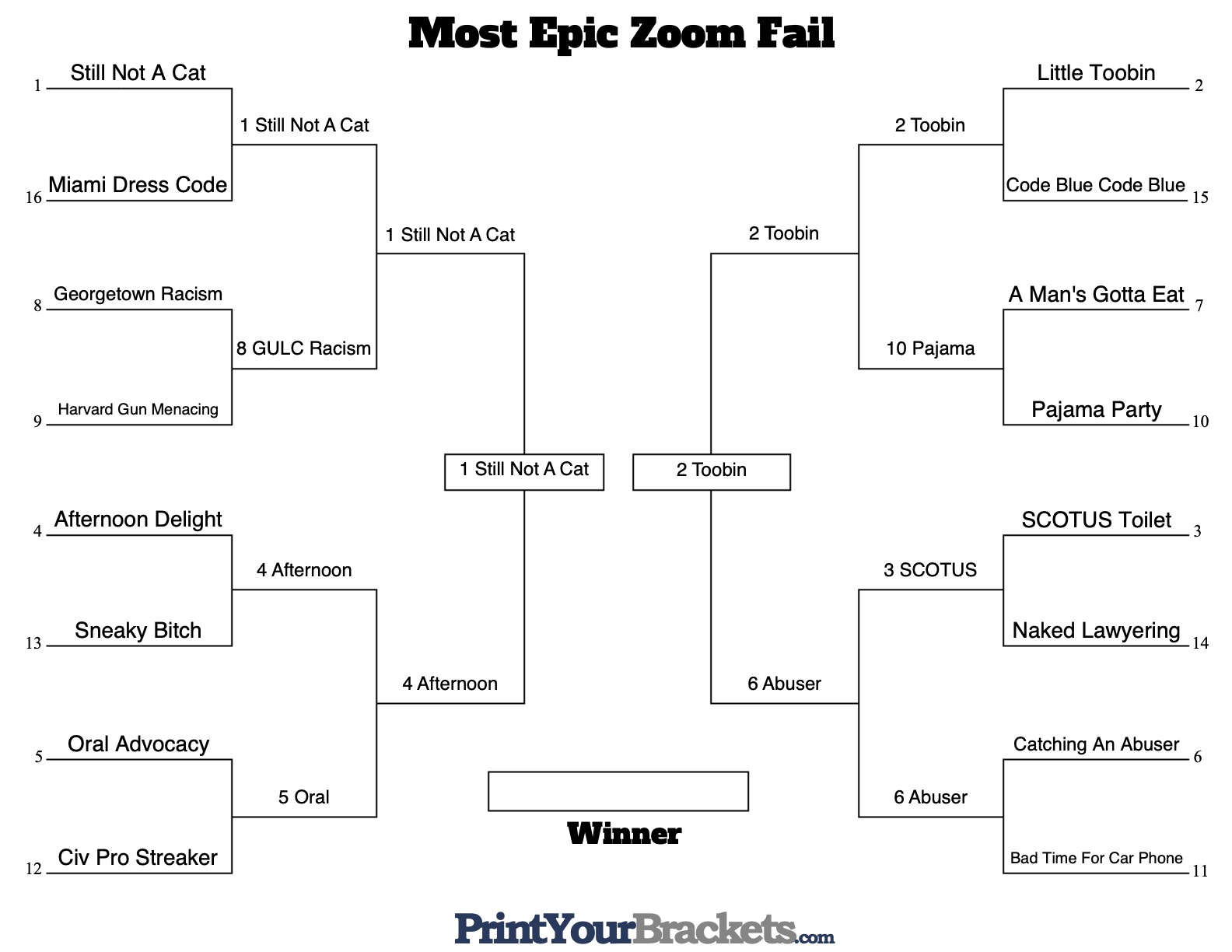 The Women’s NCAA tournament ended with a thriller between Stanford and a scrappy underdog in Arizona, but the Men’s tournament has brought us inexorably to the place we all expected: Gonzaga and Baylor. Much like the latter tournament, this year’s ATL bracket has also brought two heavy-hitters together in the final round. “I’m not a cat” at the 1 seed will square off against the second-seeded Jeffrey Toobin’s… ahem, “seed.”