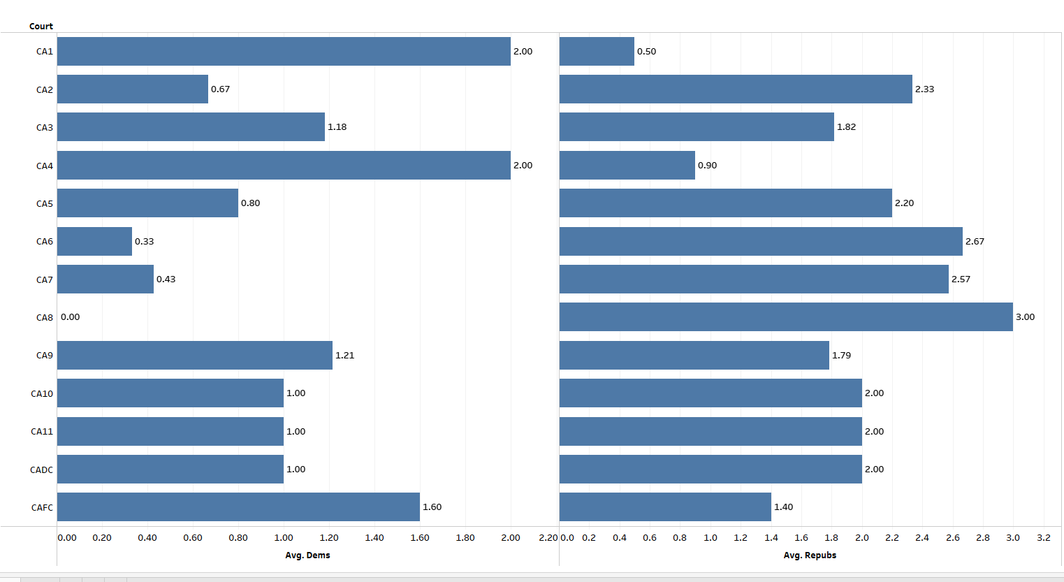 Panels in 10 of the 13 circuits had more Republican than Democratic judges. This correlates fairly closely with the decisions for plaintiffs versus decisions for plaintiffs in the pie chart. There were only two circuits with more decisions for plaintiffs than decisions for defendants.