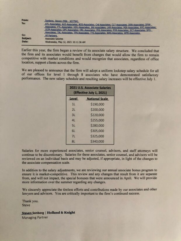 HOLLAND & KNIGHT — MEMO RE: 2021 SALARY INCREASE