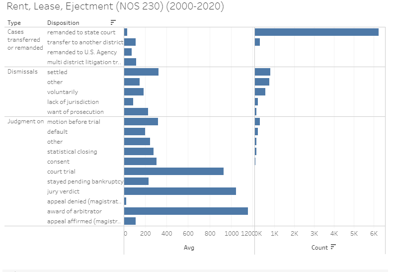As one might expect, cases that were remanded to state court and dismissed for lack of jurisdiction have the lowest average case duration. Cases disposed of by a judgment on motion before trial had a case duration of 444 days. Cases that were dismissed based on a settlement had a case duration of 455 days. Although many cases are dismissed through settlement, the case duration for that common disposition can vary substantially from one type of case to another. For example, other contract actions were dismissed because of settlement within 370 days on average while product liability personal injury cases were dismissed within 1,119 days. The speed of rental and lease actions is largely due to the fact that the most common disposition is for the case to be remanded to state court.