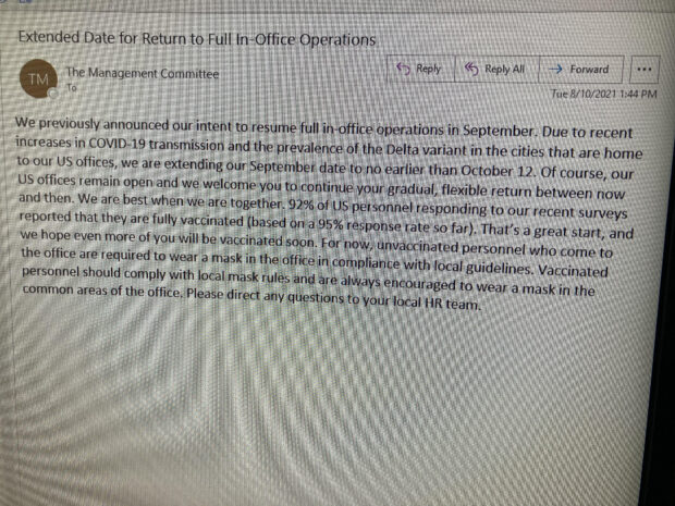As noted in the e-mail below, xxx, xxx, xxx and I had hoped to welcome everyone back to our Americas offices the week of September 13th. However, due to the rise of the Delta variant of COVID-19, we have changed our plans. The Americas Management Committee has decided to defer the return to office-based working in the region, setting a target return date for the week of October 25th. If that date changes (including an earlier date), we will provide you with at least 30 days’ notice. Our number one priority is your health and well-being and we will continue to evaluate our return plans as new information becomes available.