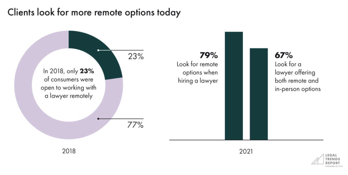 Quite the jump from 23 percent in 2018 to 79 percent saying they’re more likely to hire a firm if it offers remote communication options today! While the New York Times is busy trying to spin the narrative that remote work is a fad pushed by lazy associates that we should all forget about, the reality is that clients bought into the remote world as much or more than the lawyers. Handling matters remotely is not incompatible with lawyers working from a physical office, but when the clients aren’t interested in meeting face-to-face it’s difficult to double-down on returning to the old ways.