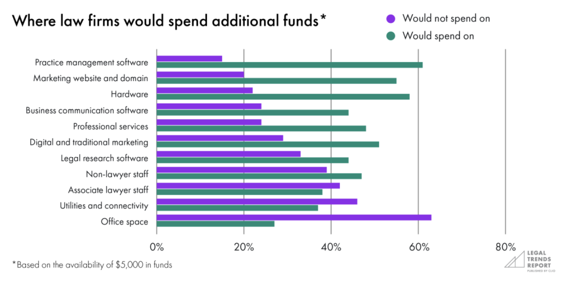 We’ve talked a lot about the decline of the physical office, but this question asks a slightly different and more telling question: lawyers wouldn’t even spend on improving their offices if you gave them free money. It’s not just that they aren’t seeking out new floorspace, lawyers don’t care about putting up more artwork or replacing the desks. If the office is no longer the situs of most client interaction, there’s no reason to squander resources on it. This may frustrate the banks that have all their eggs in the commercial real estate basket, but lawyers who embraced the remote work model see opportunities to maximize profits leveraging technology and downsizing on office space.