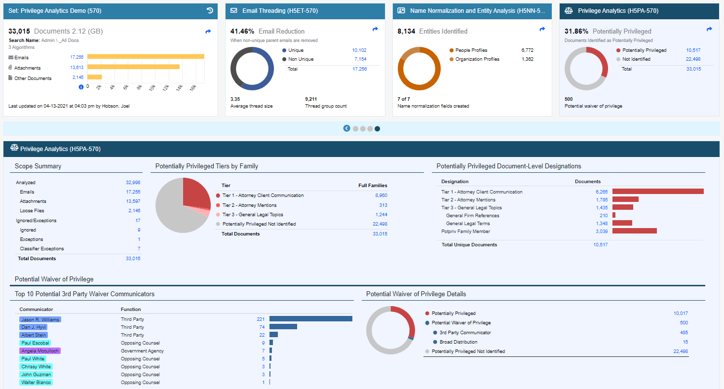 H5 is finally changing all that. H5’s sophisticated Matter Analytics application was built from the ground up to give you a better eDiscovery experience from within Relativity. The Privilege Analytics solution within Matter Analytics blends together analytics capabilities and proprietary, pre-trained linguistics models to help you more easily identify privileged content, create better workflows for reviewing it, focus in on potential privilege-breaking scenarios, and seamlessly create privilege logs.