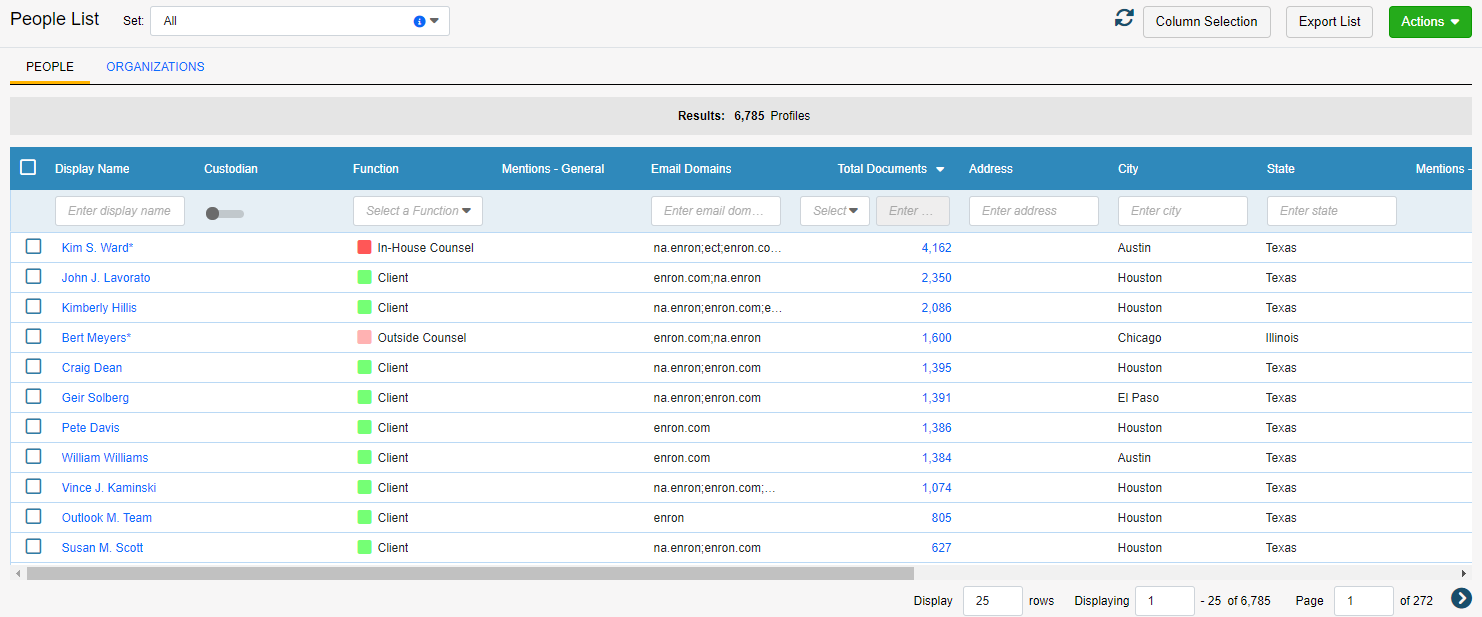 Name normalization doesn’t stop at a party’s function. It takes into account all the different variations in how a person is addressed and the different email addresses they might use. Domain names are also parsed to better understand the organizations at play in your document set. Accounting for all these variances is usually a painful slog of merging profiles and cleaning up details that takes significant time in its own right. Privilege Analytics makes it easy, and this is yet another useful feature that you can carry forward into other matters.