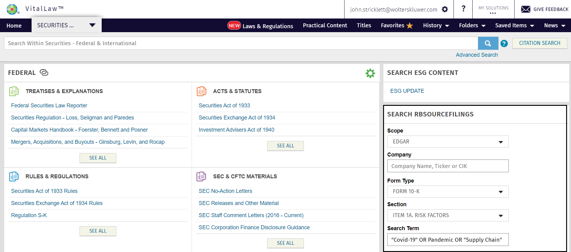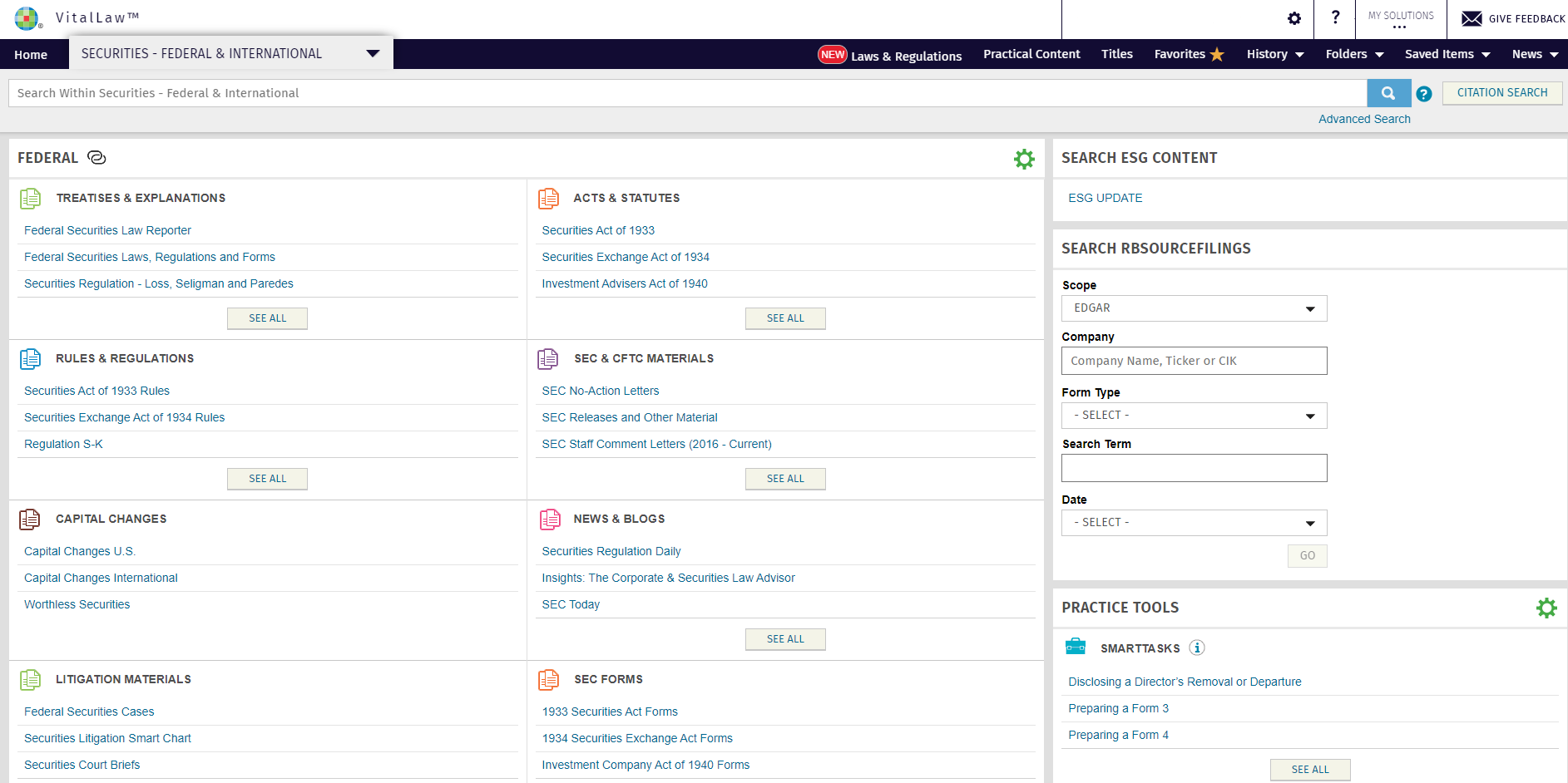 VitalLaw’s rich universe of content includes treatises, acts and statutes, a complete set of forms, and more. There are news and blogs that provide current awareness information, including two dailies – the Securities Regulation daily, which provides deep insight from VitalLaw’s attorney editors, and the SEC Today daily, which profiles major filings and rule activity from the SEC.