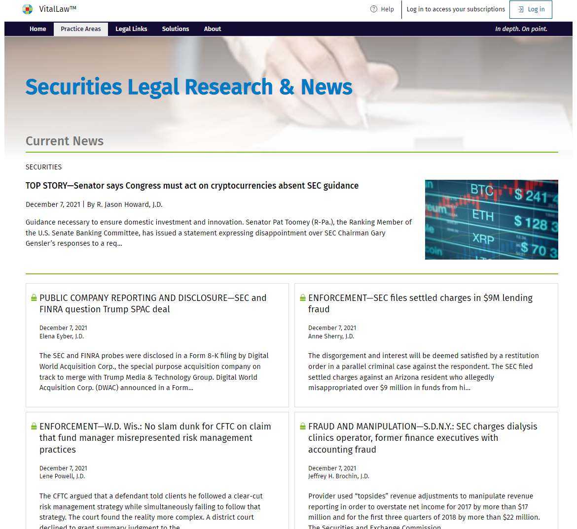 When you click into the securities area of VitalLaw Public, you’ll see top stories relevant to the practice area, which include accessible links to any referenced primary source materials.