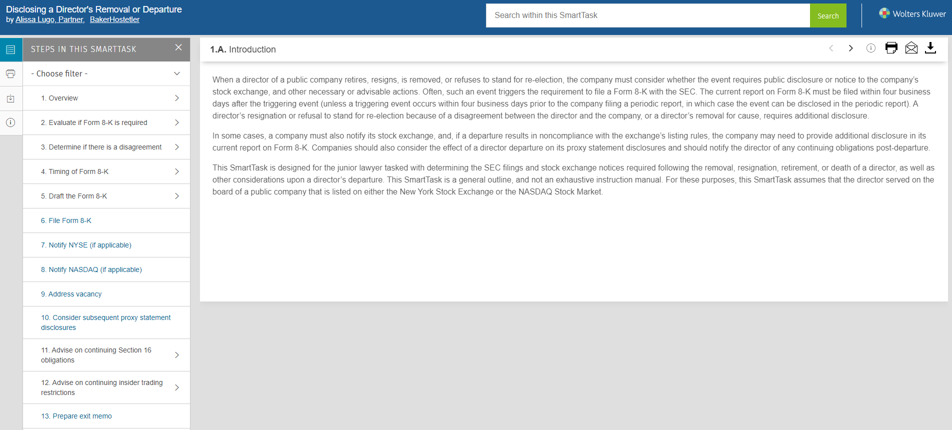 SmartTasks provide step-by-step best practices for completing every element of tasks, transactions, forms, filings, and more. There’s no better way to know that your work is accurate and that you haven’t missed any critical aspects of a task. In a practice area with as much on the line as securities and capital markets, the peace of mind you get from SmartTasks is a game-changer.