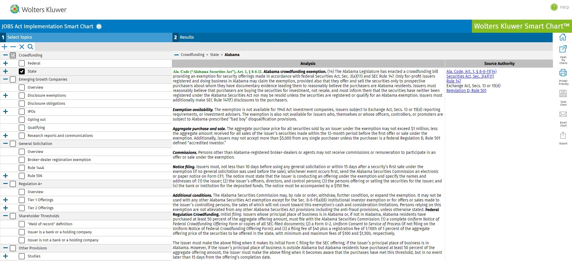 SmartCharts are critical to understanding how securities laws are being applied and enforced across various jurisdictions. For example, you can pull up a SmartChart on the JOBS Act and see essentially a 50-state survey of its application across the country.