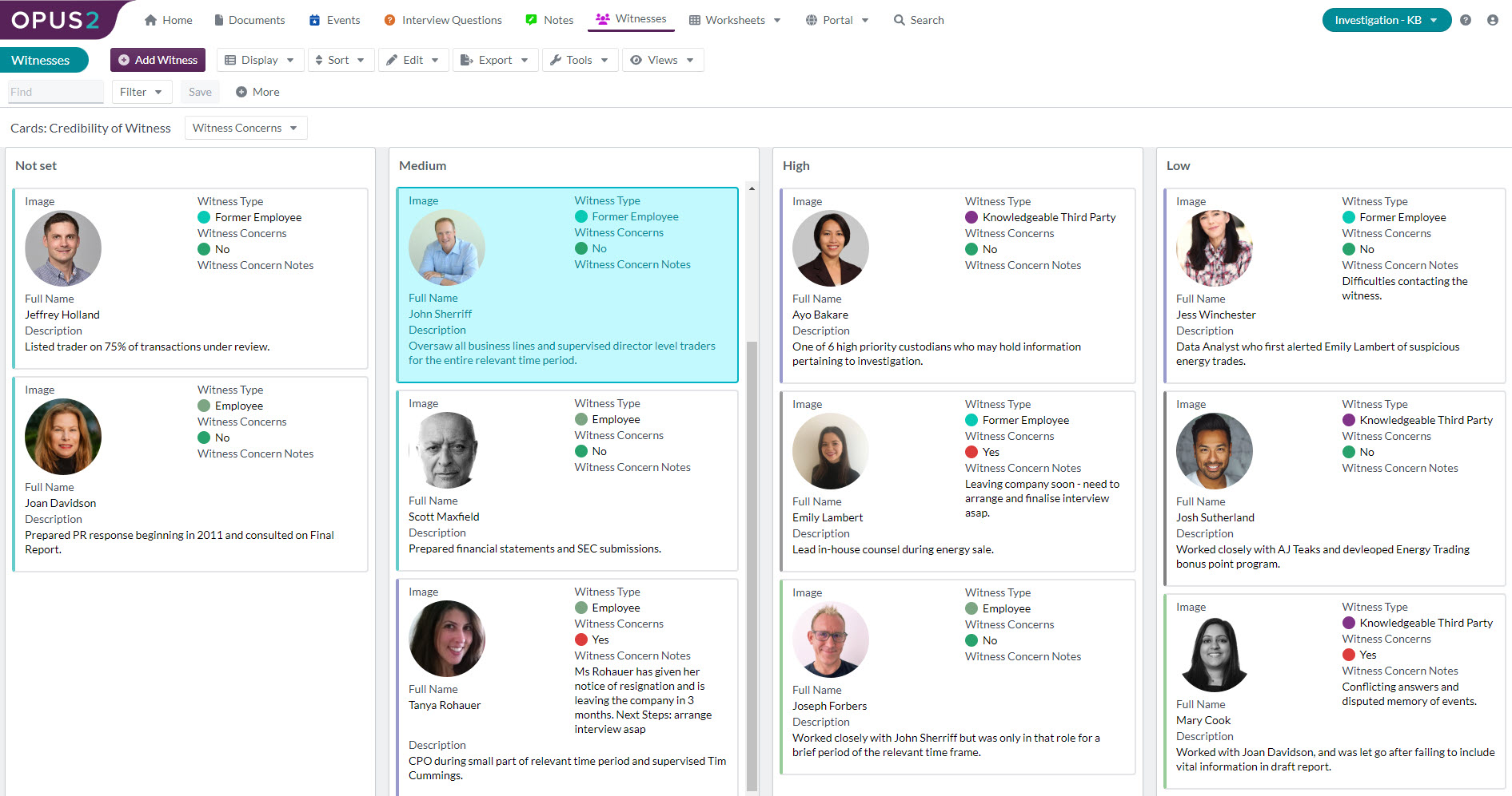 That’s the fully configurable dashboard that can be set up to reflect your interests and role in an investigation. There’s a lot of information on here. Witnesses listed and broken out by location, contact information, notes about roles and the relevant topics they can speak to. You can flag them with the concerns you have. They can be categorized by quality and you can see the status of scheduling. There’s also a section featuring interview questions “to be reviewed” or not that gives the partner an opportunity to see if the team has new insights that can be added to future interviews or rejected.