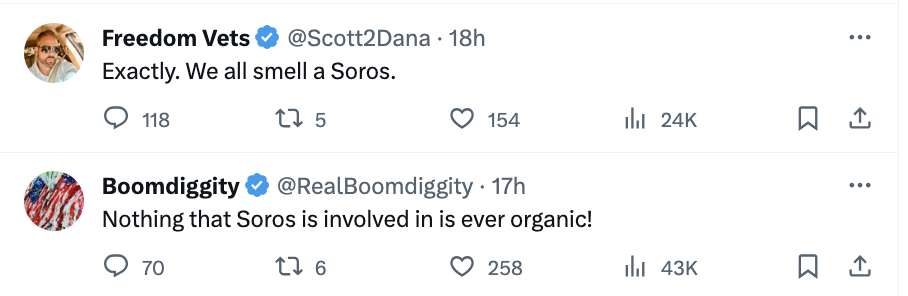 Before normal people started ratioing Miller’s post with pictures of his objectively inorganic qualities (let’s just say he had a blank space baby *click* and he wrote some hair), his followers went hard for the George Soros conspiracy rhetoric. The monsters may turn out to be just trees, but they can be lucrative trees for America First Legal. MAGA culture absolutely hates Taylor Swift because she’s a successful unmarried woman who tells fans to register and vote. Posturing as an anti-Swiftie — and tacitly encouraging followers to tie her to every wingnut boogeyman from vaccines to George Soros — is just good business for someone looking to financially feast off the MAGA hog.