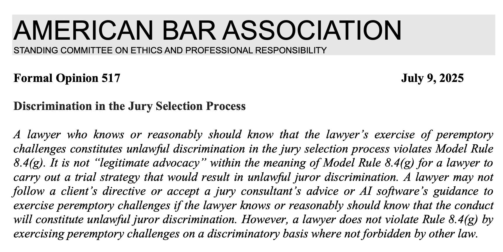 #13 “ABA Says Unlawful Jury Selection Bias Not ‘Legitimate Advocacy’.” From Bloomberg Law: “Peremptory juror challenges that constitute unlawful discrimination violate the American Bar Association model ethics rules even if a client orders that such challenges be made, the ABA says in a new ethics opinion. But lawyers facing such quandaries don’t violate ABA ethics rule 8.4(g) when they exercise peremptory challenges to prospective jurors on a discriminatory basis when not forbidden by other law. Courts have allowed lawyers to use peremptory challenges based on a prospective juror’s age, marital status, and other factors, the ABA opinion says.” Read more here. And download the new Formal Opinion 517 here.